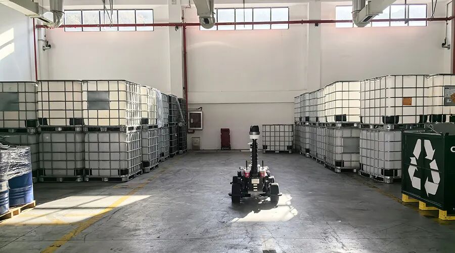 为破解危废品存储安全管控的难点痛点,企业引入防爆轮式巡检机器人,专项承担仓库夜间巡检任务。机器人搭载公司研制的激光导航系统,可沿巡检路线精准穿梭于各仓库,实现多维度隐患智能监测:通过高清视觉系统识别液体泄漏、阀门开关状态,借助气体传感器实时监测可燃气体和有毒有害气体浓度,利用红外热像仪捕捉异常升温点,同步采集异常声音信号。