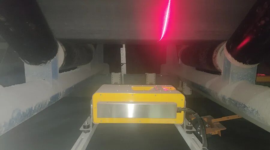 此外,因长期高速运转,皮带磨损较大,下部易发生撕裂故障。为此,在落料口增设皮带纵撕检测机器人开展皮带撕裂定点监测,一旦发现撕裂缺陷立即触发报警。机器人可实时采集皮带底部图像信息,当出现裂纹、裂口等撕裂前兆时,机器人系统快速完成诊断分析并告警,确保第一时间响应处置。