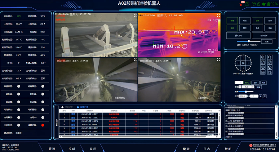 机器人主要用于检测皮带机设备组件温度、现场烟雾、温湿度、有害气体与粉尘浓度,识别监测落料撒料、皮带跑偏及撕裂、电机与减速机振动、托辊异响以及现场人员与环境安全等,构建起多维度设备安防体系。