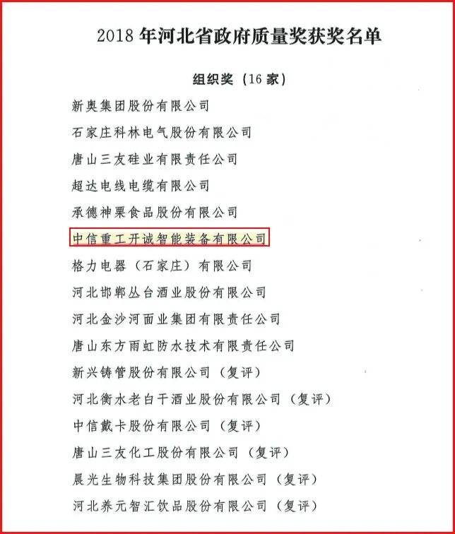 近日,河北省政府质量奖获奖名单揭晓,中信重工开诚智能喜获“2018年河北省政府质量奖”。
