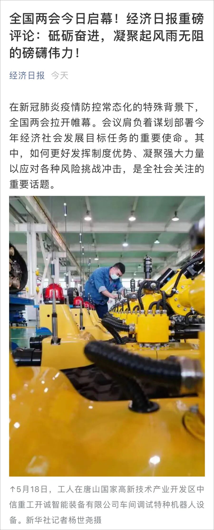 ▲ 经济日报以图片新闻形式,报道了中信重工开诚智能在疫情防控的特殊背景下,发挥技术创新优势,逆风跋涉,砥砺前行,赢得应对风险挑战、谋划产业发展的一个又一个胜利。