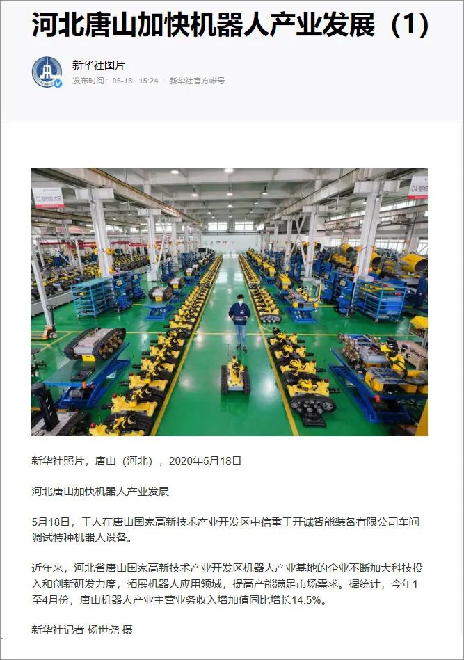 ▲ 新华社以视频和图文形式报道了中信重工开诚智能自复工复产以来,不断加大科技投入和创新研发力度,拓展机器人应用领域,努力夺取“疫情防控”和“产业发展”的双胜利。