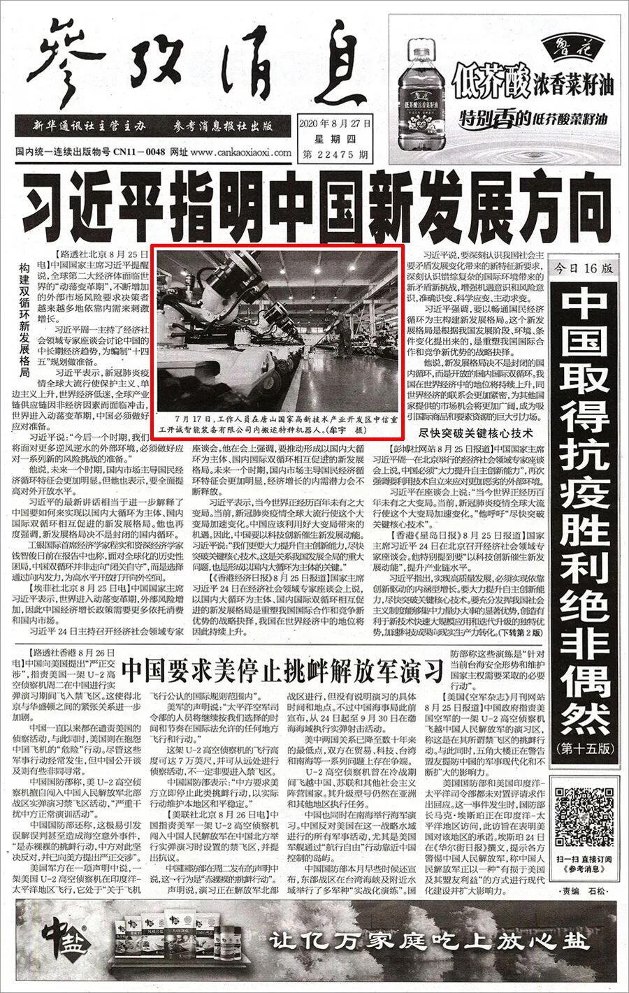 8月27日,新一期《参考消息》头版头条刊发文章《习近平指明中国新发展方向》,采用中信重工开诚智能特种机器人生产场景作为压题图片。